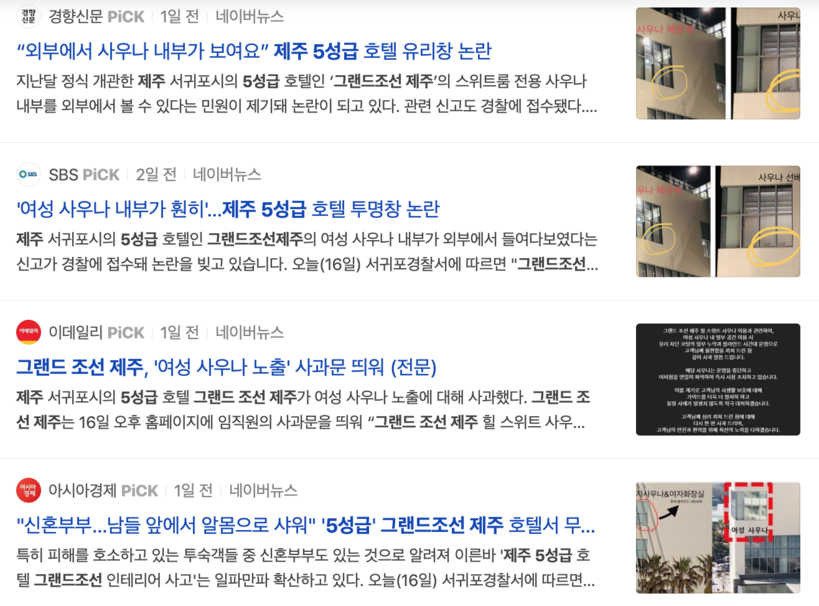 한편 그랜드조선 제주는 17일 여성 사우나 노출과 관련 공사과문을 통해 “여성 사우나 내 일부 공간 이용 시 유리 차단 코팅의 일부 누락과 블라인드 시간대 운영으로 고객님께 불편을 끼쳐 드린 점 깊이 사과 드린다"며 “해당 사우나의 운영을 중단 조치했다”고 밝혔다.