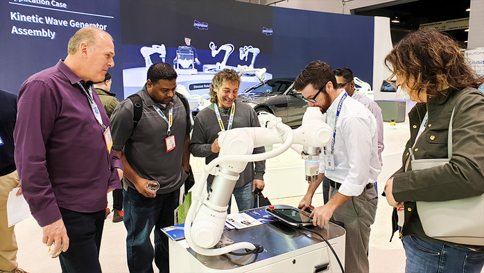 | ▲지난 4월 미국 시카고에서 열린 자동화 기술 관련 북미 최대 전시회인 ‘오토메이트(Automate) 2019’에 참석한 두산로보틱스 협동로봇 시연 장면.(사진=두산로보틱스 블로그 캡처) |