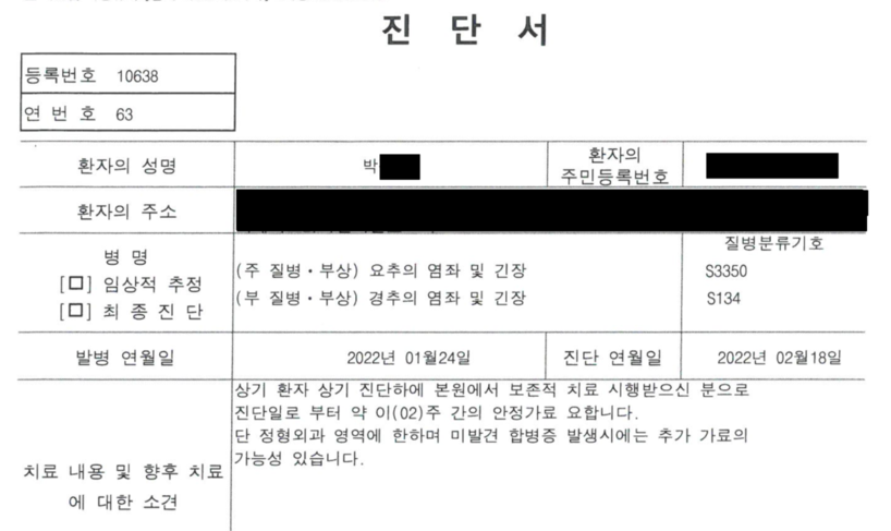 진단서에는 발병일이 사고 당일인 1월 24일로 되어 있으며 “환자는 본원에서 보존적 치료 시행을 받으신 분으로 진단일(2월 18일)로부터 약 2주간의 안정가료(병이나 상처를 낫게 함)를 요한다. 단 정형외과 영역에 한하며 미발견 합병증 발생시에는 추가 가료의 가능성이 있다”라는 치료 소견이 담겼다.