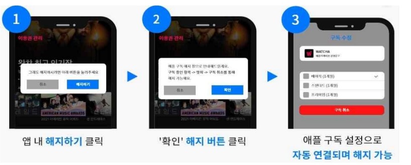 즉, 아이폰 이용자가 모바일 앱 구독서비스를 해지하기 위해서는 앱 외부에 있는 아이폰 단말기 ‘설정’ 메뉴 → ‘내정보(Apple ID)’ 메뉴 → ‘구독관리’ 메뉴 → ‘구독항목’ 메뉴 → ‘구독취소’ 등 5단계를 통하거나 전화(고객센터) 또는 홈페이지를 이용해 해지를 신청해야 했다.