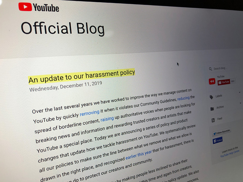 11일(현지시간) 유튜브는 자사의 공식 블로그를 통해 인종, 성별, 성적 지향성 등을 바탕으로 누군가를 모욕하는 영상은 삭제하겠다고 밝혔다. 이같은 정책은 기존의 차별금지를 뛰어넘는 반(反)괴롭힘 정책(harassment policy)으로 밝히며 이 기준에는 직접적인 언급이 아닌 "은연중이거나 암시적인 위협"도 포함했다고 밝혔다.
