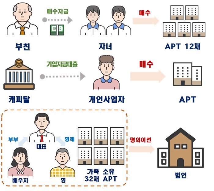 위법 의심 유형은 법인 명의신탁, 무등록 중개, 가족 간 편법증여, 법인대표 자금 차입, 계약일 거짓신고, 소명자료 미제출, 대출용도 외 유용 등이다. 미성년 자녀 명의로 아파트를 매수한 뒤 필요 자금은 부친이 승계방하는 식으로 조달하거나 캐피탈 등 여신전문업체에게 기업자금 명목으로 돈을 빌린 뒤 아파트를 매수하는 식이다.