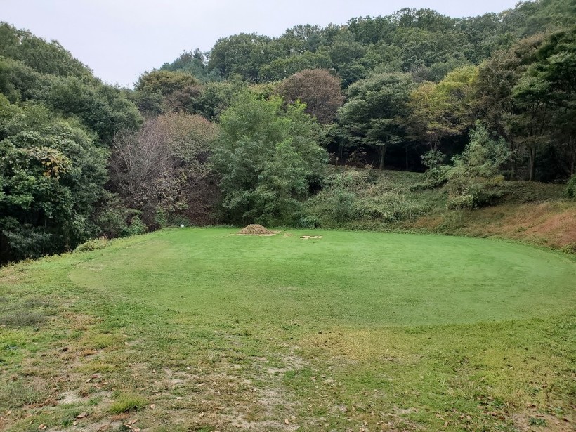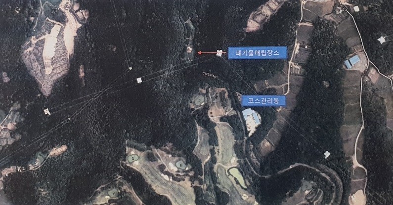 A씨는 “2015년 1월경부터 같은 해 3월경까지 파인크리크 골프장 6개 홀의 그린공사를 시행하면서 나온 그린 잔디 예지물(잔디 부스러기)과 코어물(잔디줄기 및 뿌리모래가 붙어있는 폐기물) 등 산업폐기물 수십 톤을 합법적인 장소에 처리하지 않고 코스관리동 진입로 내리막 우측에 불법 매립했다”고 주장했다.