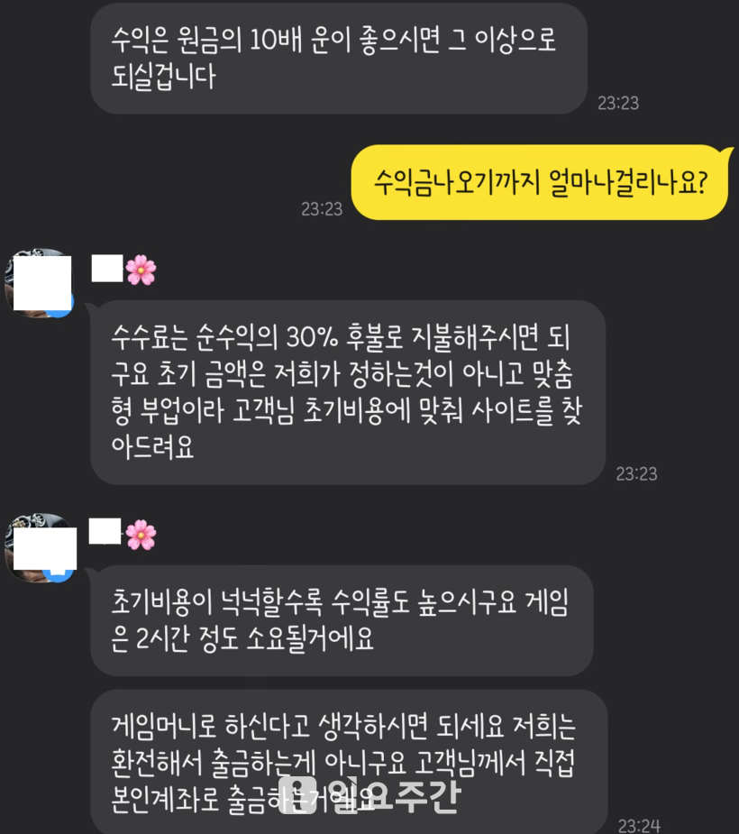 A 씨는 “처음 가입할 때 초기비용으로 100만 원을 넣으면 10배의 수익을 내주겠다고 해서 혹하지 않을 수 없었다”며 “별다른 의심 없이 저에게도 큰돈이 들어올 거라는 희망을 안고 채팅 시작을 했다”고 말했다.