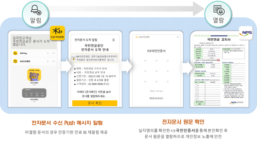 KB 뱅킹앱 이용자는 국민연금 전자문서 수신 Push 알림이 뜨면 수신 동의 및 본인 인증 후 안내문을 열람할 수 있고, 열람하지 않으면 MMS·카카오톡·네이버앱 또는 우편물로 안내문이 발송된다.