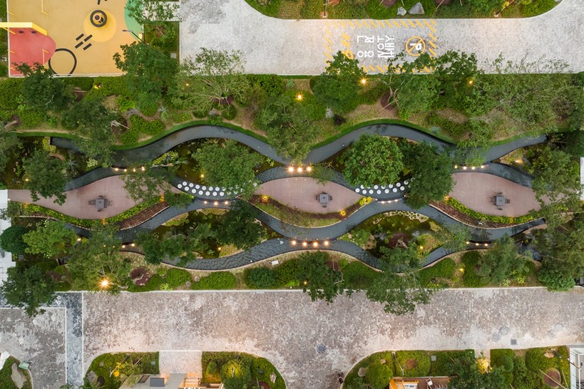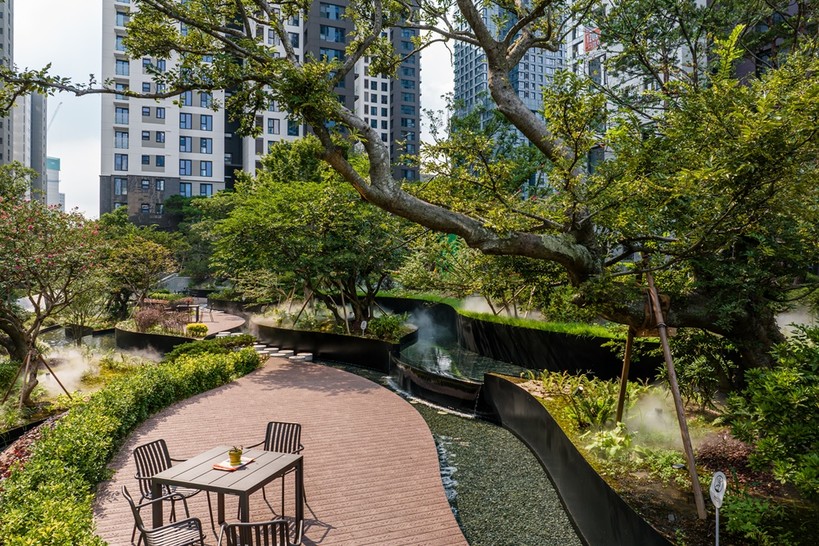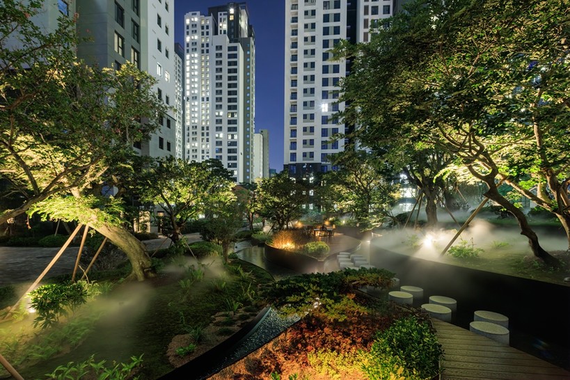 수상작 ‘래미안 그린 캐스케이드’는 래미안 원베일리 단지 내 콘크리트 옹벽을 조경적 해법으로 극복한 공간이다. 2.5m 높이를 다섯 단으로 나눈 조경 테라스로 구현했으며, 녹지와 수경, 휴게시설로 구성된 이 공간에는 유해 물질을 흡수하는 이끼를 활용해 안개 낀 숲 속에서 편안히 쉴 수 있는 주민 휴게공간으로 재탄생시킨 것이 특징이다.