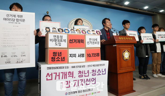 | ▲바른미래당, 민주평화당, 정의당, 민중당, 노동당, 녹색당, 미래당 등 원·내외 7개 정당과 선거개혁 청년·청소년행동 관계자들이 지난 6일 오전 서울 여의도 국회 본청 정론관에서 열린 선거개혁, 청년·청소년 1만 지지선언 기자회견에서 연동형 비례대표제 도입, 18세 선거권 보장, 선거구 획정 법정기한 준수를 촉구하고 있는 모습. |