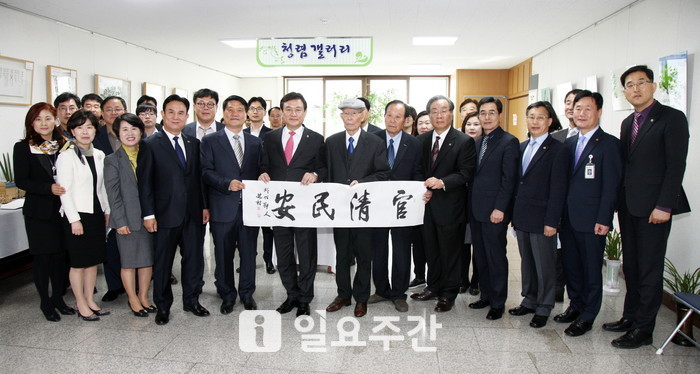 ▲ 2018년 3월 28일 충북도교육청 청렴시화전 개막식에서 지촌 허룡 선생의 서예 퍼포먼스