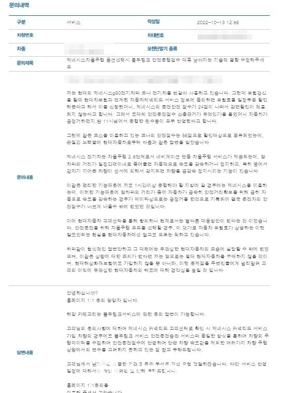 A 씨는 13일 현대차 측에 ‘제네시스 자율주행 옵션 선택 시 블루링크 안전운행 점수 대폭 낮아지는 기술적 결함 수장해주세요’라고 문의했다.