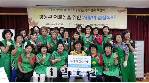 중식은 기업에서 후원을 하고 강동구새마을부녀회원 약 50여 명이 전날부터 음식을 준비하여 후원기업에서 나온 직원들과 함께 음식을 만들어 음식상을 손수 차려 드립니다. 약 천 여명, 어르신들과 자원봉사자들이 함께 하는 한마음의 날은 1995년부터 2019년 현재까지 약 24년간 1년 내내 한 달도 쉼 없이 꾸준히 해왔습니다. 아마도 전국에서 강동구만이 유일하게 어르신들을 위한 ‘한마음 공동체의 날’을 이어오고 있을 것입니다.