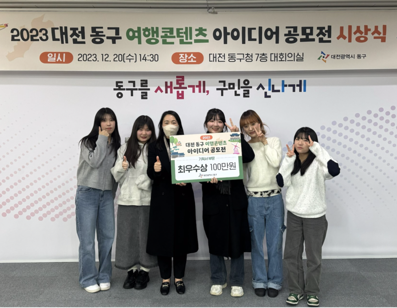 ▲'2023 대전 동구 여행콘텐츠 아이디어 공모전'에서 최우수상을 수상한 선문대 미디어커뮤니케이션학부 학생들.(사진=선문대학교 제공) |