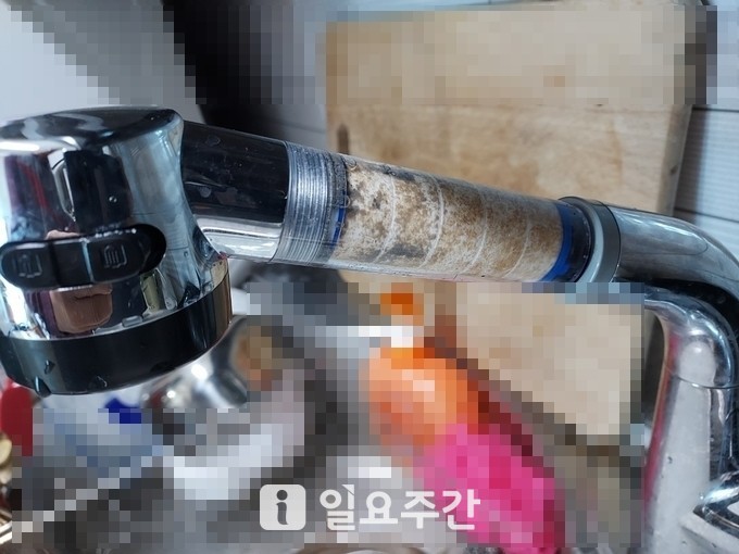 ▲전기온수기를 가동하면 필터가 장착된 싱크대헤드에 녹물과 이물질이 걸러진다.(제보자 제공) |
