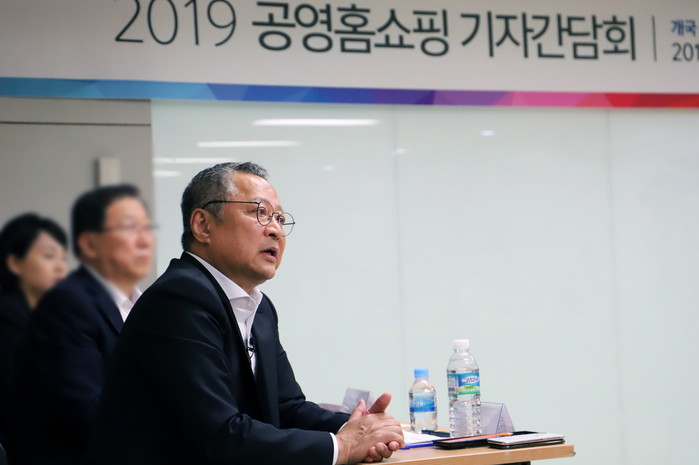 ▲ 최창희 공영홈쇼핑 대표가 지난 7월 10일 서울 여의도 중소기업중앙회에서 취임 1주년 기자간담회를 작고 있는 모습. |