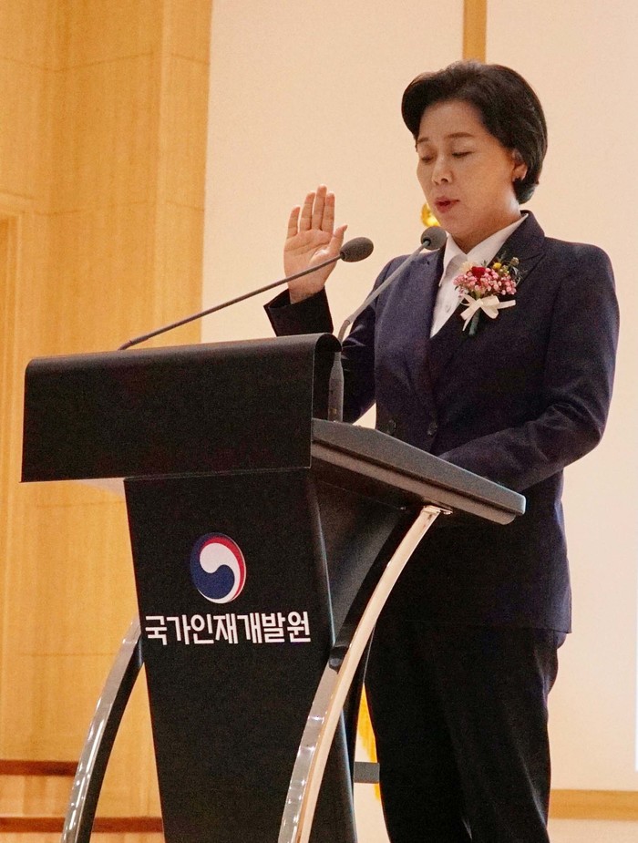 ▲ 지난해 8월 31일 국가공무원인재개발원 진천캠퍼스에서 열린 '제28대 양향자 원장 취임식'에서 양향자 신임 국가공무원인재개발원장이 취임선서를 하고 있는 모습.(사진=국가공무원인재개발원 제공) |