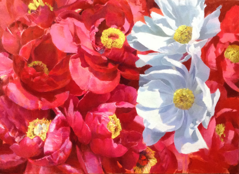 ▲ 이일훈 화백! 모란의 활짝 핀 순간, 그 숨 막히는 절정의 순간을 붉은꽃과 흰꽃을 상호 교차시켜 역동적으로 표현하였습니다.