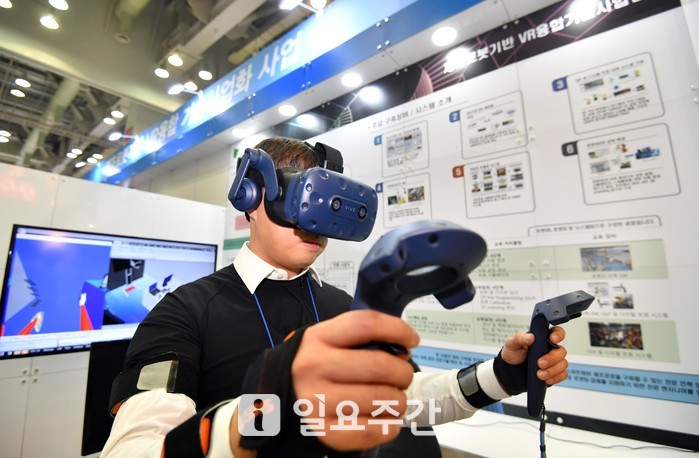 ▲ '제9회 부산국제기계대전'에 참여한 한 업체 관계자가 VR기술이 적용된 작업동작 분석 시스템을 시연하고 있는 모습. |