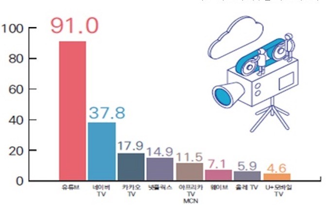 시청 1위인 유튜브는 91.0%, 2위부터 5위까지는 각각 네이버 TV(37.8%), 카카오 TV(17.9%), 넷플릭스(14.9%), 아프리카 TV(11.5%) 순으로 조사됐다.
