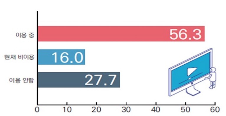 유튜브 등의 동영상 서비스를 사용하는 시청자는 전체의 56.3%로 나타났고 이용안함은 27.7%로 드러났다. 동영상 서비스의 이용빈도는 매일(26.0%)과 주 3~4일(26.0%), 주 5~6일(20.4%) 순이다. 하루 이용시간을 살펴보면, 주중 평균 이용시간은 56분, 주말 평균 이용시간은 64분으로, 주중보다 주말에 OTT 등 동영상 서비스를 더 많이 시청하는 것으로 조사됐다