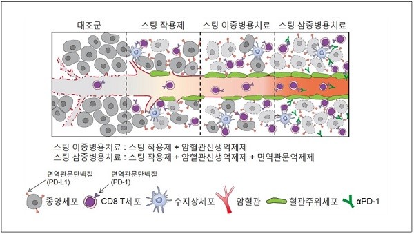 스팅 작용제가 해로운 암혈관을 억제하는 한편 면역반응에 이로운 혈관만을 남겨 면역세포가 암 내부로 잘 침투할 수 있도록 한다는 설명이다.