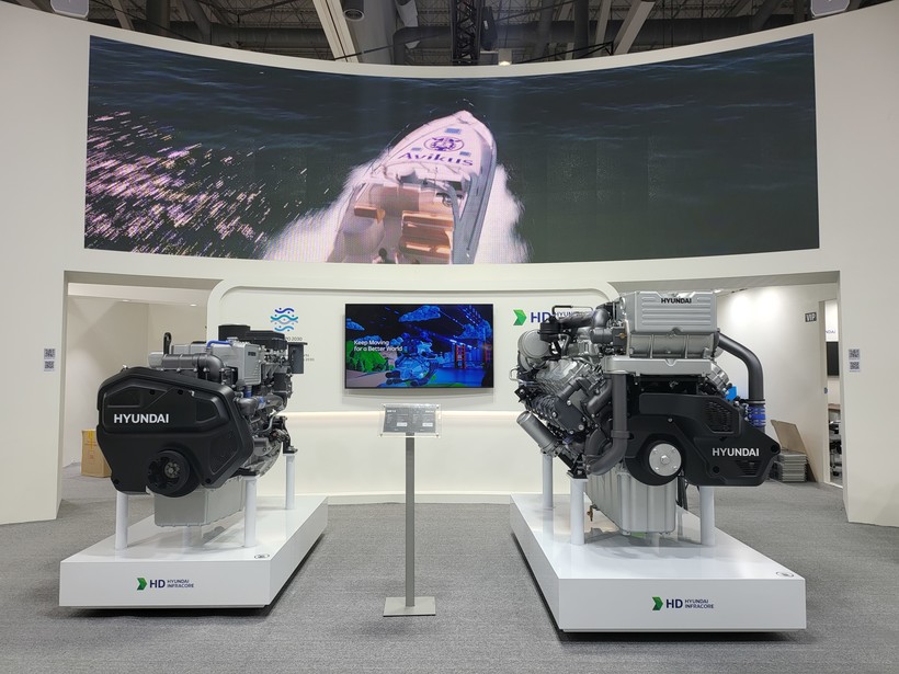 HD현대인프라코어는 국제해사기구(IMO)의 최신 유해물질 배출규제인 IMO Tier III를 만족하는 전자식 엔진인 6기통의 DX12와 12기통의 DX22, 2가지 모델을 공개한다.