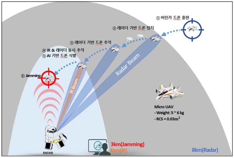 레이더 연동 안티드론 통합솔루션은 초소형 드론을 탐지·식별·전파교란 단계를 거쳐 작동 불능 상태로 만들어 미상의 드론이 군 중요시설에 접근하는 것을 차단한다.