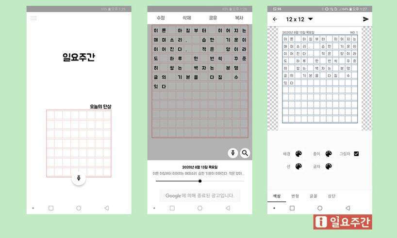 또 쓴 일기를 배경와 종이, 원고지의 선, 글자 등의 색상을 개별로 바꾸어 공유할 수 있는 기능도 있어 편리하다.