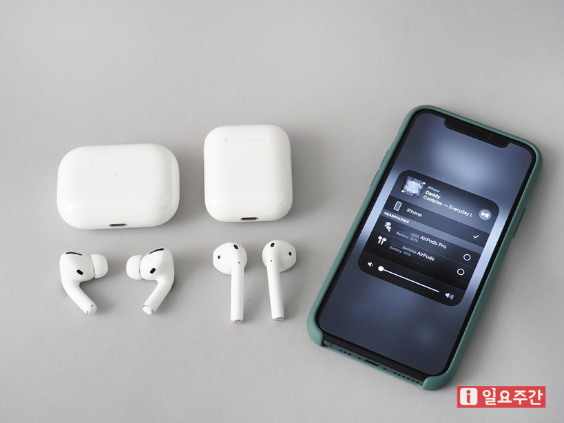 ▲1세대 에어팟과 애플 에어팟 프로, 동시에 연동 가능 (사진=지혜수 기자) |