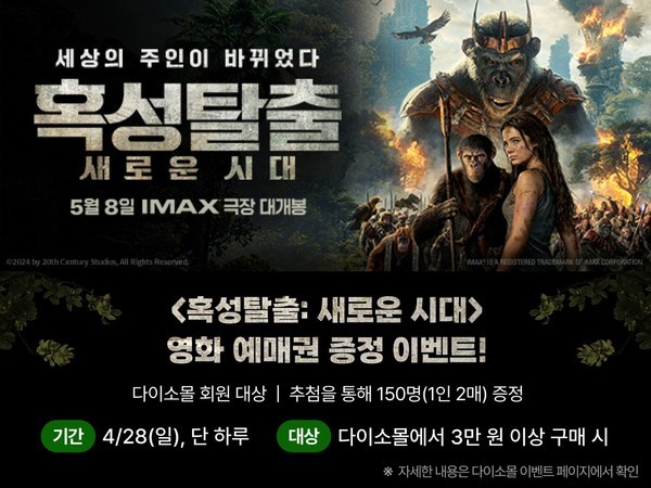 이번 이벤트는 이날 단 하루 동안 다이소몰에서 3만 원 이상(상품금액 기준) 구매 시 자동으로 응모가 된다. 추첨을 통해 '혹성탈출: 새로운 시대' 영화 예매권을 150명에게 2매씩, 총 300매 증정한다.