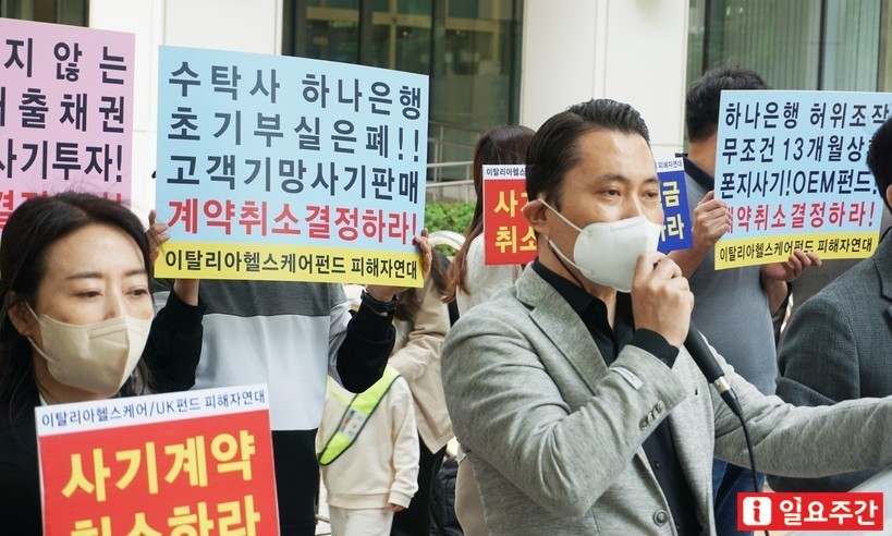 ▲지난달 19일 서울 영등포구 금융감독원 앞에서 열린 기자회견에서 이탈리아 헬스케어 펀드 투자 피해자들은 “판매사인 하나은행은 고객들에게 이탈리아 정부가 망하지 않는 한 원금이 보장된다. 조기상환은 13개월 이내에 무조건 된다고 설명했으나 모두 거짓이었다”라고 주장했다. <사진=성지온 기자> |