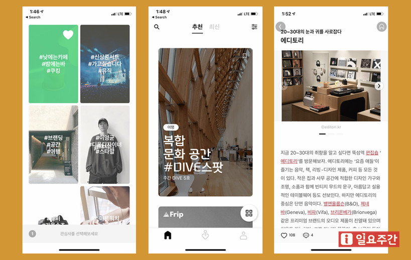 이 앱은 여행과 음악, 스타일, 디자인, 요리 등의 햇김 카테고리를 중심으로 다양한 주제에 맞게 세팅된 콘텐츠를 무한 제공한다. 이 콘텐츠는 처음 앱을 깐 후 관심 카테고리 항목을 여러 개 선택해 두면, 큐레이션 서비스처럼 사용자의 취향을 분석해 독특하고 알찬 정보를 전달해 준다.