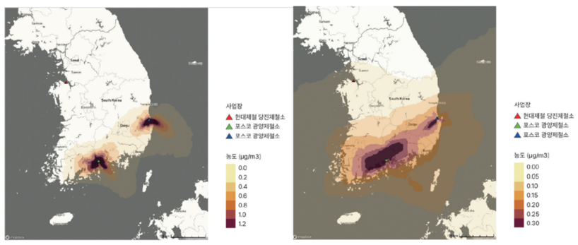 조사 대상 제철소 가운데 건강 피해 원인 기여가 높은 곳은 광양제철소, 포항제철소, 당진 순으로 나타났다.