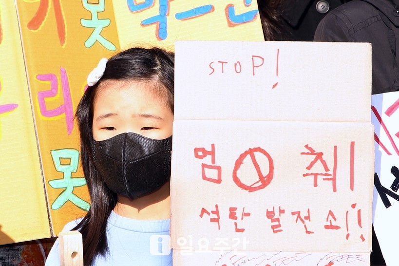 | ▲탈석탄법 제정을 위한 시민사회연대는 지난 11월 23일 국회 정문 앞에서 기자회견을 열고 “탈석탄”을 촉구했다. 이날 기자회견에 참석한 어린이가 석탄발전소 건설을 반대하는 내용이 적힌 피켓을 들고 있다.(사진=이수근 기자) |