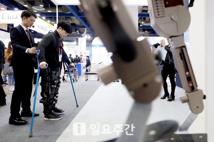 ▲14일 서울 강남구 코엑스 Hall A에서 열린 '제35회 국제의료기기·병원설치 전시회(KIMES)'의 재활 의료기기 부스 직원들이 재활운동을 시연하고 있는 모습. |
