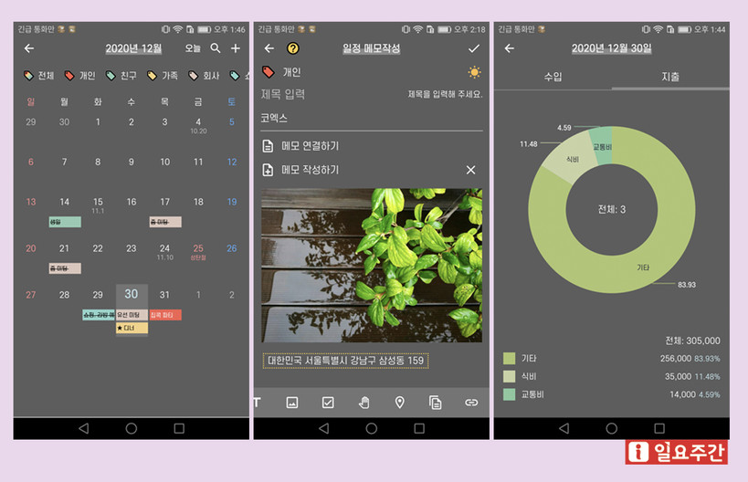 ▲일정과 메모 관리뿐 아니라 가계부까지 쓰임새 많은 '나의비서 나비' 앱 (이미지 편집=일요주간) |