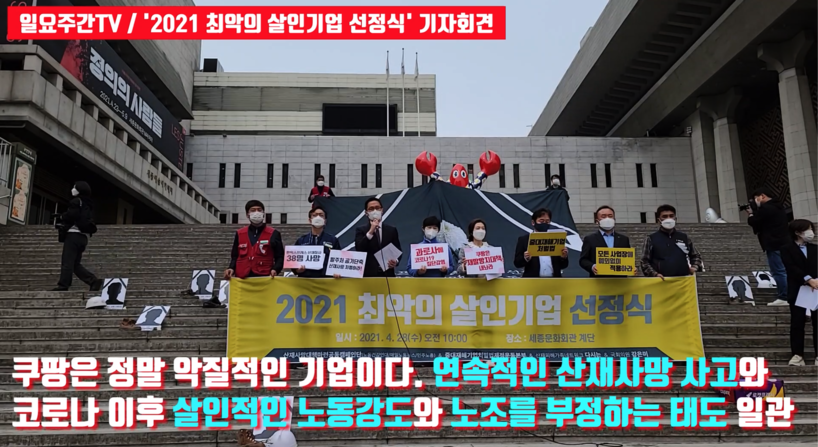 [일요주간TV=김상영 기자] 민주노총, 노동건강연대, 매일노동뉴스 등으로 구성된 산재사망대책마련 공동 캠페인단(이하 산재사고캠페인단)은 지난 4월 28일 오전 10시 서울 종로구 세종문화회관 앞에서 ‘2021 최악의 살인기업 선정식' 기자회견을 개최했다.