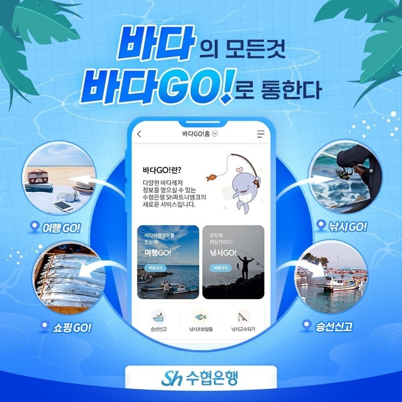 ▲ Sh수협은행(은행장 강신숙)은 22일, 모바일뱅킹앱「파트너뱅크」를 통해 해안 관광과 낚시 정보, 수산물 쇼핑 등 바다여행 관련 통합 정보를 제공하는 ‘바다GO!’ 서비스를 오픈했다.(이미지=Sh수협은행) |
