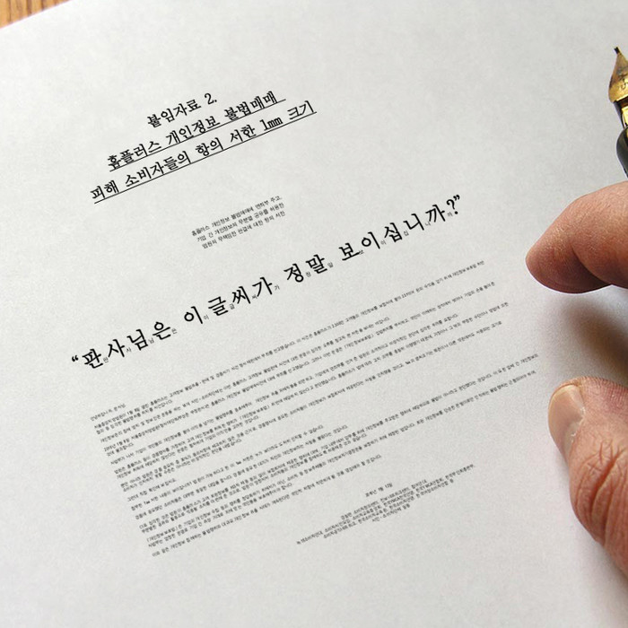 | ▲ 지난 2016년 1월 법원이 홈플러스가 응모권에 1㎜ 글씨로 보험사에 개인정보를 제공할 수 있다는 내용을 표기해 고지의 의무를 다했으므로 아무런 문제가 없다고 판결한 것에 대해 참여연대 등 13개 시민·소비자단체가 홈플러스의 고객정보 불법판매 행위에 대해 무죄를 선고한 서울중앙지법 형사16단독(부상준 부장판사) 1심 재판부에 1㎜ 크기 글씨로 작성한 항의 서한을 전달해 화제가 됐다.(사진=참여연대 제공) |