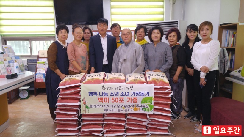 ▲ 용천사 해바라기봉사단은 두 달에 한 번씩 소년소녀가장, 독거노인, 장애인, 지역복지시설에 백미 기탁, 반찬 나눔, 장학금 기증 등 다양한 봉사활동을 꾸준히 이어오고 있다. |