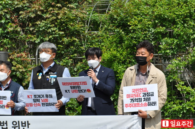 박현용 변호사(민주사회를 위한 변호사모임 민생경제위원회)는 28일 서울 서초구 중앙지방법원 앞에서 열린 기자회견에서 구현모 KT 대표이사의 엄벌 및 신속 판결을 촉구하면서 이같이 말했다. 국회의원 불법 쪼개기 후원과 관련해 미국 행정기관의 과징금 부과 처분에는 합의한 구 대표가 국내 재판부의 벌금형에는 반발한 것을 두고 한 발언이다.
