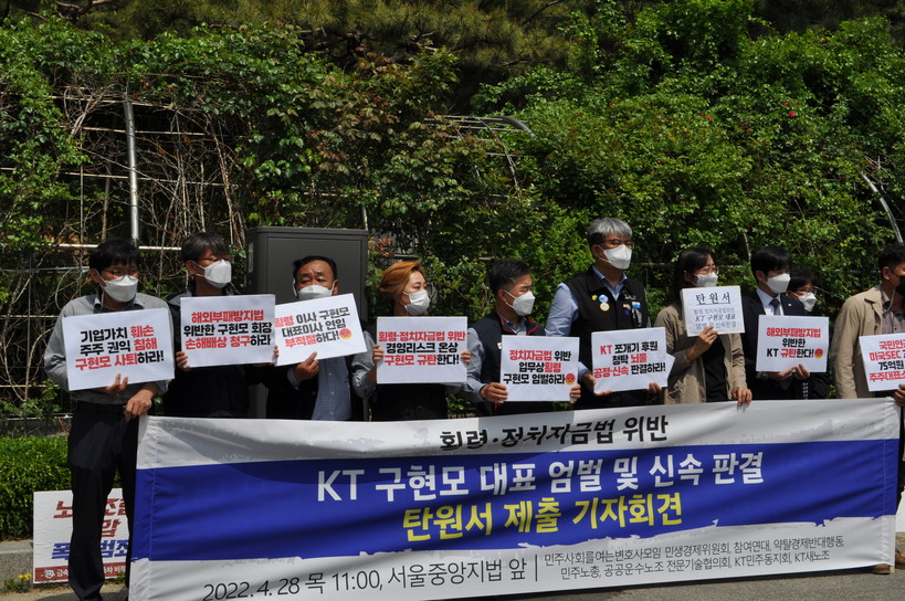 | ▲28일 서울 서초구 중앙지방법원 앞에서 노동계, 시민사회단체 등이 횡령 및 정치자금법 위반 혐의를 받고 있는 KT 구현모 대표에 대해 엄벌 및 신속 판결을 촉구하는 기자회견을 개최했다. <사진=성지온 기자> |