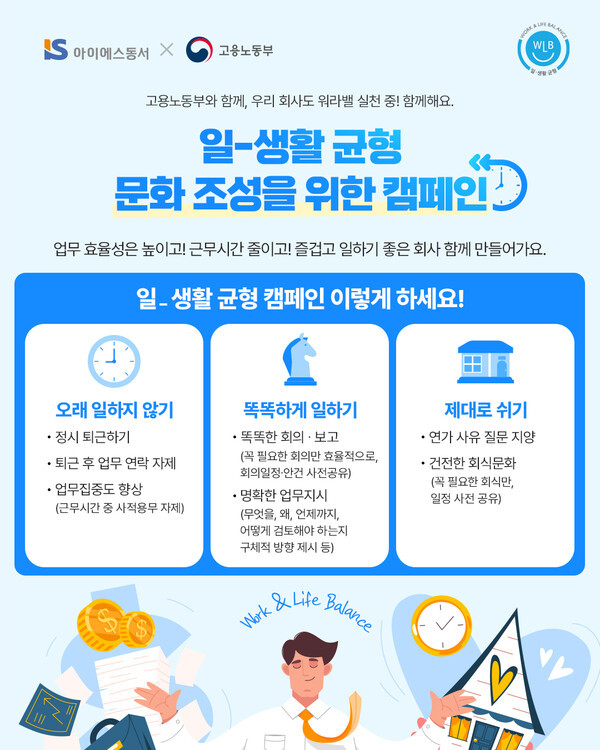 [일요주간 = 엄지영 기자] 아이에스동서(IS동서)가 고용노동부가 주관하는 ‘일·생활 균형 캠페인’ 참여기업으로 선정됐다.