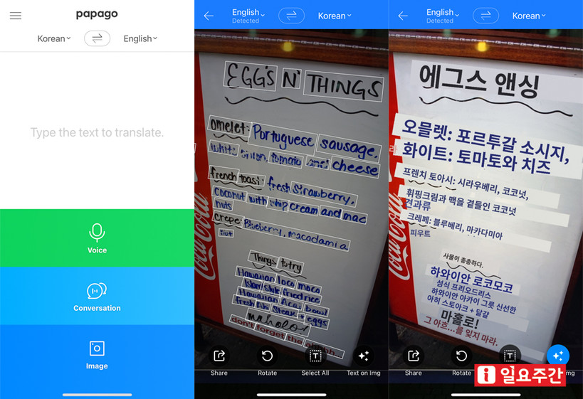 [일요주간 = 노현주 기자] 네이버는 번역앱 파파고(Papago)의 이미지 속 텍스트까지 번역해주는 이미지 ‘바로번역’ 기능을 새롭게 추가했다.