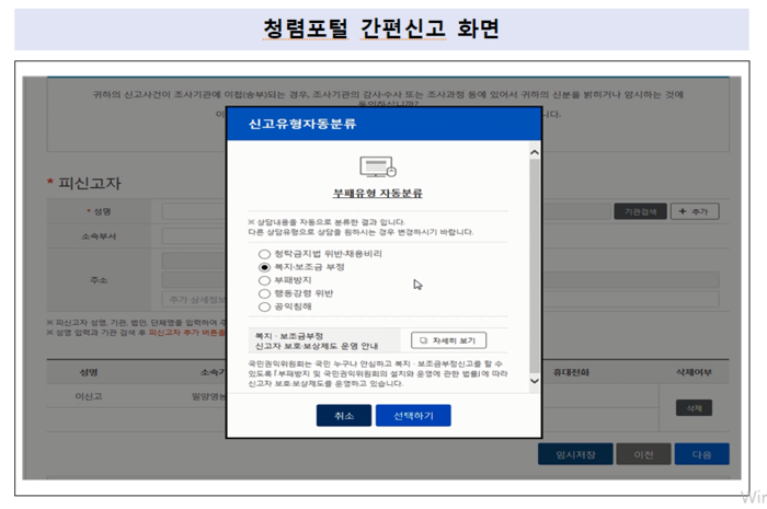 신고자가 간편 신고를 이용해 신고하는 경우 신고내용 등을 분석해 신고유형을 자동 추천해주고, 이에 대한 보호, 보상제도 안내문을 보여준다. 또 권익위에 축적된 판례, 심의의결례 등을 가공해 제작된 1000여 건의 사례를 공개함으로써 신고자가 신고서 작성에 활용할 수 있도록 했다.