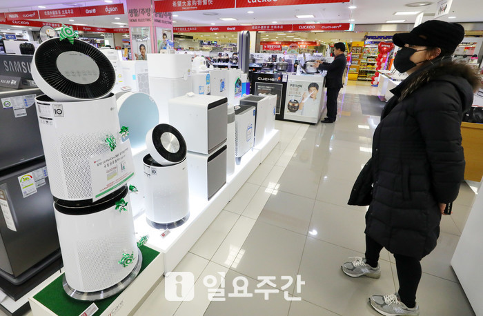 ▲사상 초악의 미세먼지로 인해 비상점감조치가 발령되는 등 미세먼지 공습이 계속되며 공기청정기와 마스크 등 관련용품 판매량도 증가하고 있다. 사진은 가전제품 판매 매장에 진열된 공기청정기 제품들. |