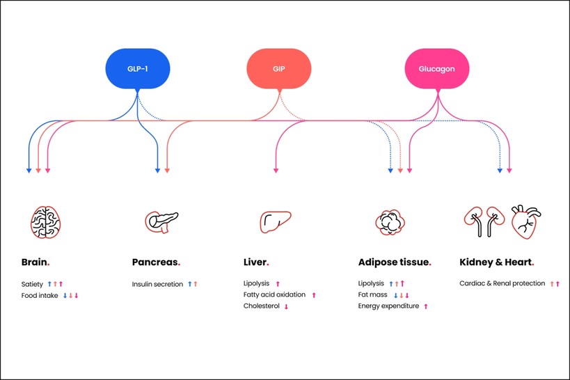GLP-1 수용체 작용제는 포만감을 증가시켜 체중을 감소시키고 인슐린 분비와 감수성을 개선해 혈당 조절을 원활하게 한다. GIP는 GLP-1 수용체 작용제의 약리학적 이점을 향상시키는 한편 메스꺼움과 구토, 설사 등 이 작용제의 일반적인 위장관 부작용을 완화할 수 있다. 글루카곤은 포만감 조절과 함께 에너지 소비 및 지질 대사 조절에도 관여한다.