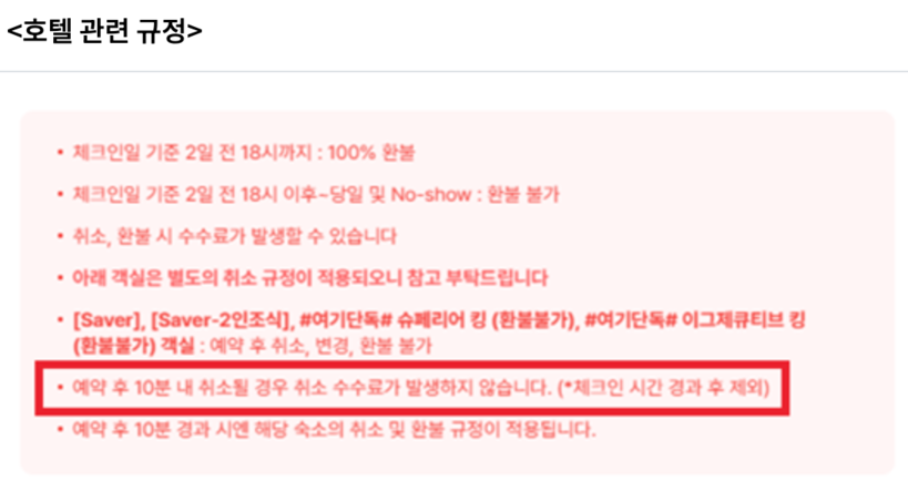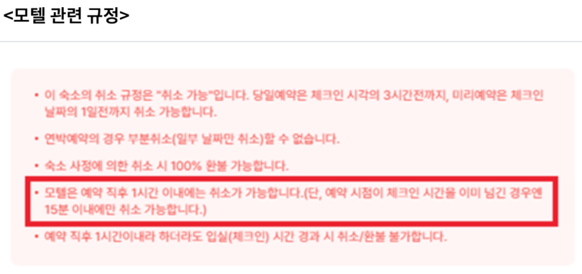 한국소비자원에 따르면 숙박플랫폼 이용자수 상위권 TOP4 업체(아고다, 야놀자, 여기어때, 트립닷컴 등) 중 국내 숙박플랫폼인 여기어때와 야놀자의 취소 및 환불 규정을 살펴보면 여기어때는 상품 구매 시 호텔은 10분 내 취소해야 취소 수수료가 발생하지 않는다. 모텔의 경우에는 1시간 이내, 체크인 시간이 지난 시점에서 예약한 경우에는 15분 이내에 취소해야 취소수수료가 발생하지 않는다.