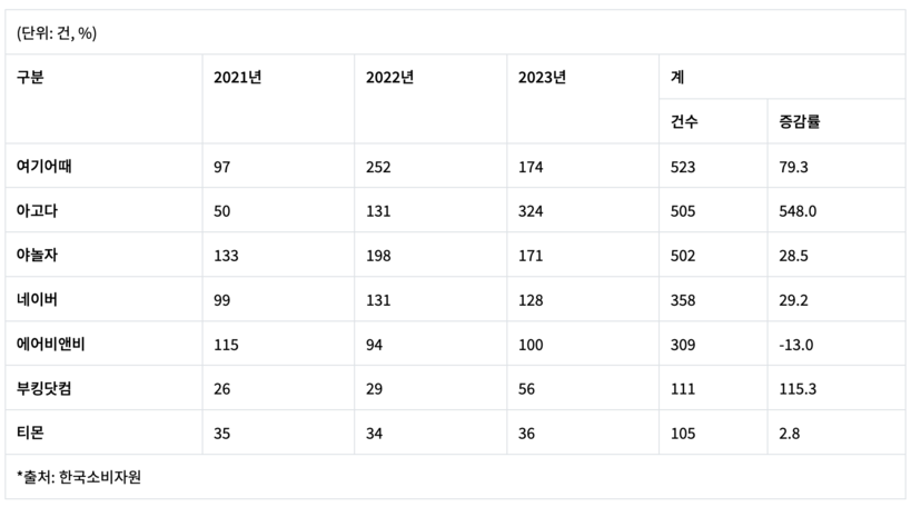 한국소비자원이 조사한 플랫폼별 피해구제 신청 건수에 따르면 여기어때가 총 523건으로 가장 많았다. 그 뒤로 아고다 505건, 야놀자 502건, 네이버 358건, 에어비앤비 309건, 부킹닷컴 111건, 티몬 105건 순으로 나타났다. 에어비앤비를 제외한 6개의 플랫폼 모두 해마다 플랫폼별 피해구제 신청 건수가 증가했다. 2021년 대비 2023년 피해구제 수의 경우 아고다가 2021년 50건, 2022년 131건, 2023년 324건으로 약 548.0%, 부킹닷컴 약 115.3%, 여기어때 79.3% 증가했다.