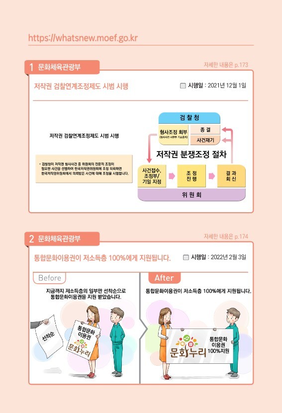 ④ 문화·체육·관광 분야에서는 ▲저작권 분쟁에 대한 신속한 해결을 위해 한국저작권위원회가 검찰과 연계하여 저작권 분쟁에 대한 조정을 시범 시행합니다.