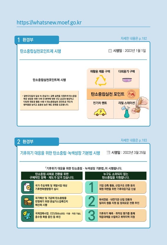 기획재정부는 새해부터 달라지는 제도와 법규사항 등을 알기 쉽게 정리한 ‘2022년부터 이렇게 달라집니다’ 책자를 발간했습니다. 이 책자에는 39개 정부기관에서 취합한 304건의 정책이 분야·시기·기관별로 구성됐고 주요 내용은 삽화로도 제시했습니다. 본지는 분야별 주요내용을 배포된 삽화와 텍스트를 정리해 카드뉴스 형식으로 정리해보았습니다. [편집자주]