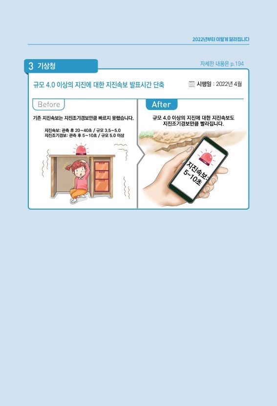 ▲4월 이후부터는 규모 4.0 이상~5.0 미만의 지진에 대해 지진속보 발표시간을 20~40초에서 5~10초로 단축해 대피 여유시간 확보합니다. [정리=노현주 기주]
